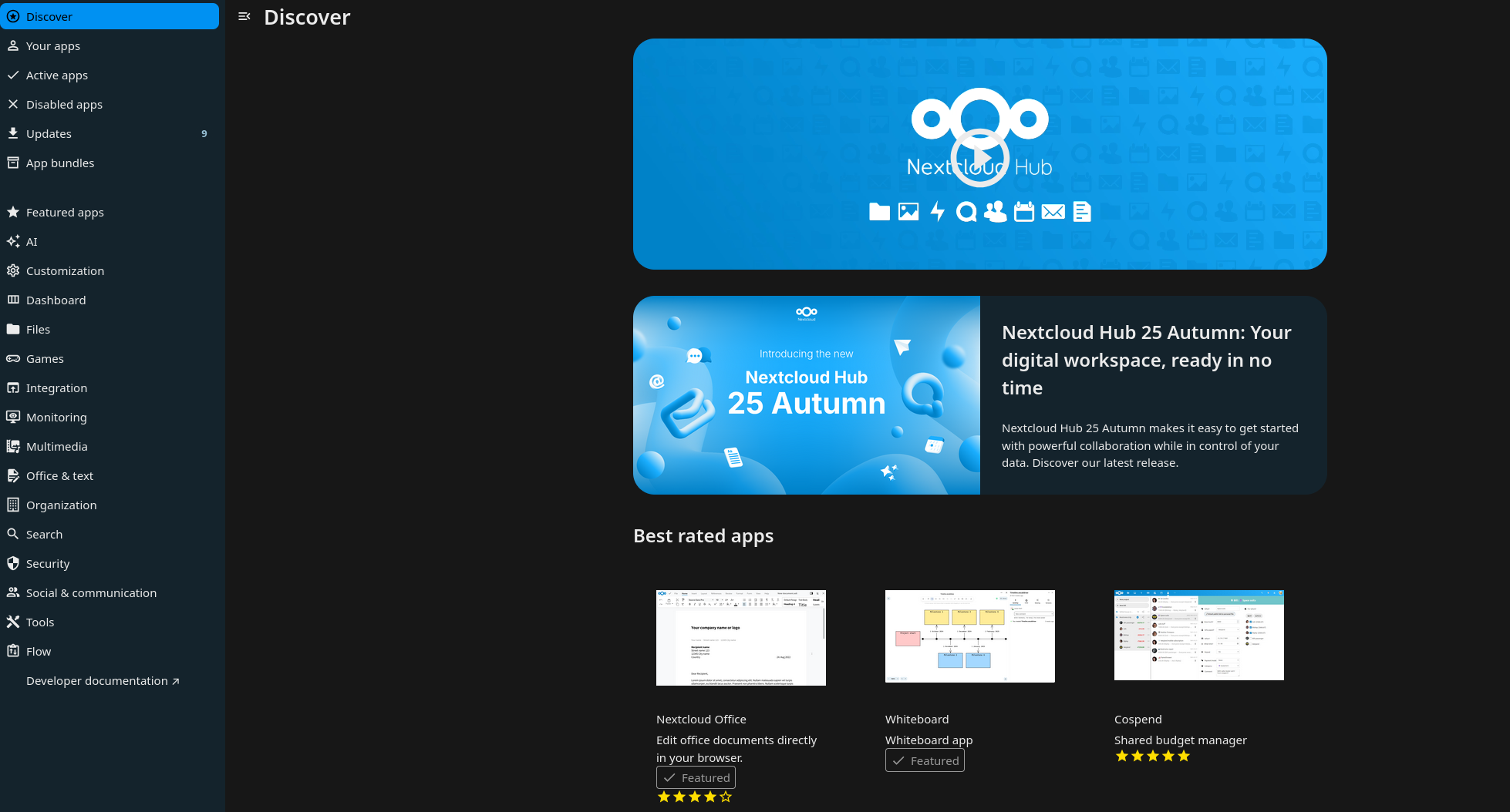 Nextcloud apps from their name are "mini applications" that extend the functionality of Nextcloud. Nextcloud has a set of core application which come installed by default when Nextcloud is installed, but it also has hundreds of other applications developed by the community to add features and integration. The applications can be found https://your-nextloud-url/settings/apps/discover