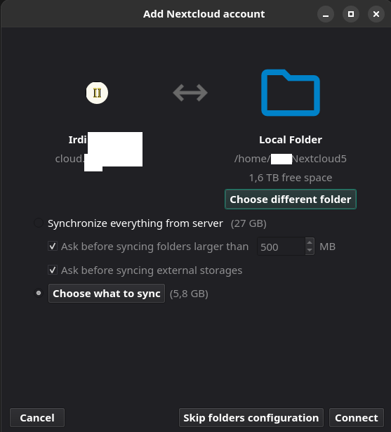 Before starting with Cryptomator you have to add your Nextcloud account your Nextcloud Desktop client and set up the local folder where the data will be stored. Example below: