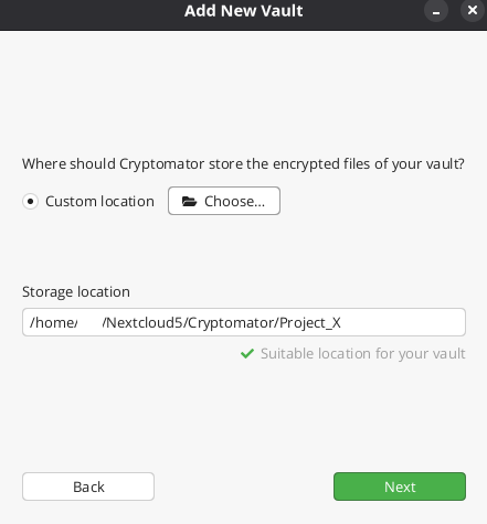 Next click Choose custom location and Choose the Cryptomator folder you created earlier.