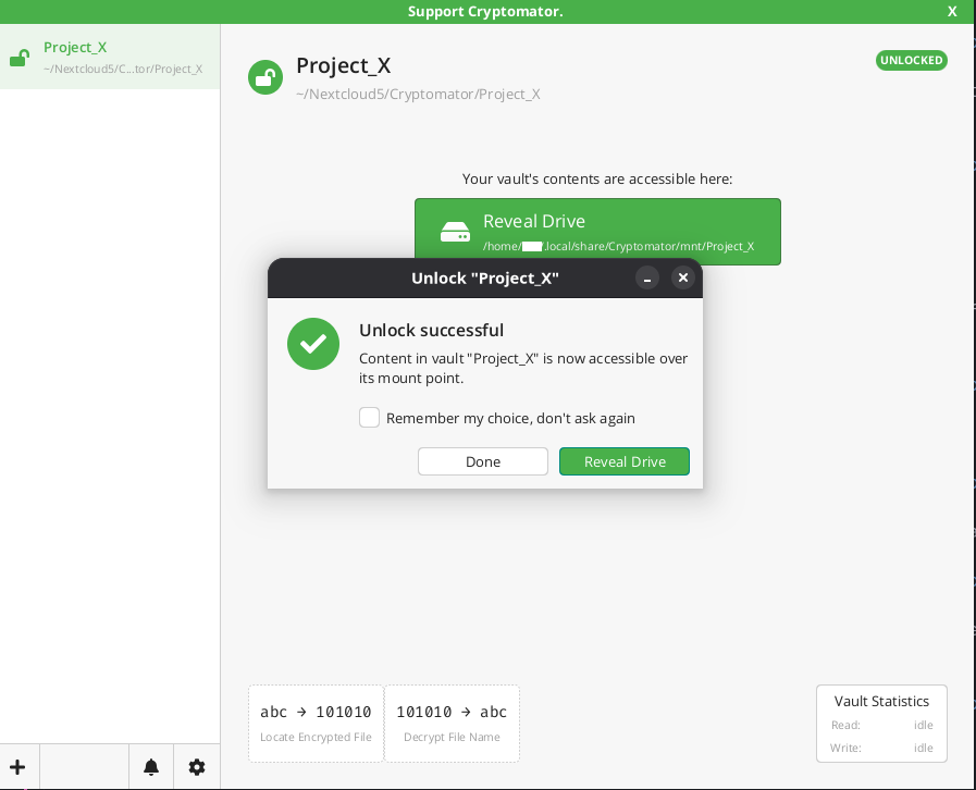 Once the vault is unlocked you will see green button, Reveal Drive. When clicked it opens the folder that you will use to upload the data. Data uploaded there is synced to Nextcloud.