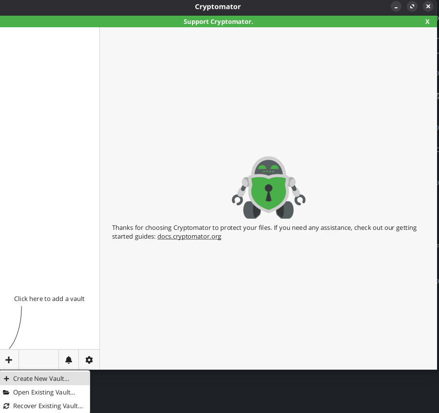 After installing Cryptomator, open it and click the + sign in the bottom left corner to add a vault and click Create New Vault.