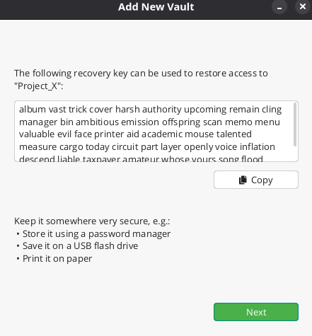 Next step is to create a strong password. Do not forget to Yes on the recovery key because without it, if you lose your password you lose access to your data.